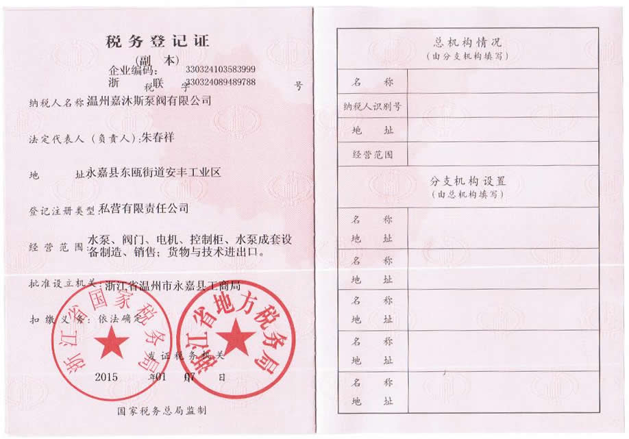 嘉沐斯稅務登記證