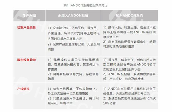 對比激光切割機(jī)加入ANDON系統(tǒng)前后效果(如表1所示)可發(fā)現(xiàn):未加入ANDON系統(tǒng)時(shí),無共享信息平臺、現(xiàn)場無看板、操作人員口頭傳達(dá)現(xiàn)場內(nèi)容,無法及時(shí)發(fā)現(xiàn)停線原因等一系列問題;而加入ANDON系統(tǒng)后,產(chǎn)品質(zhì)量、設(shè)備異常、產(chǎn)線停線等問題都有了明顯改善。因此加入ANDON系統(tǒng)強(qiáng)化了設(shè)備數(shù)據(jù)的完整性,減少了手工統(tǒng)計(jì)、記錄產(chǎn)生的工作過失,并且極大縮減了現(xiàn)場操作人員的工作量,提高產(chǎn)線生產(chǎn)加工效率。