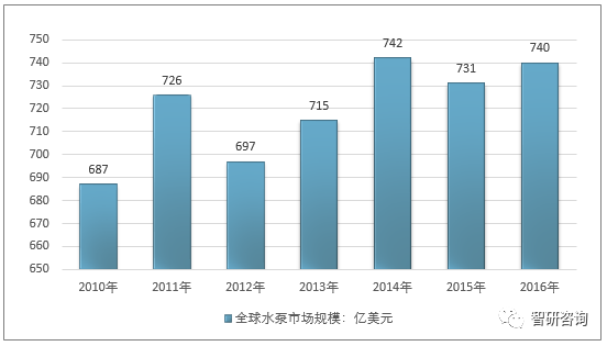 由于市場(chǎng)需求與價(jià)格的變動(dòng),近年來全球水泵產(chǎn)業(yè)市場(chǎng)規(guī)模呈現(xiàn)一定的波動(dòng)性,2016年全球水泵產(chǎn)業(yè)市場(chǎng)規(guī)模達(dá)740億美元,較2015年的731億美元增長(zhǎng)1.24%。