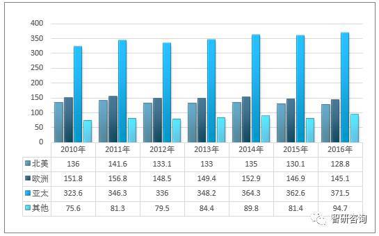 2010-2016年全球水泵市場(chǎng)區(qū)域分布(億美元)